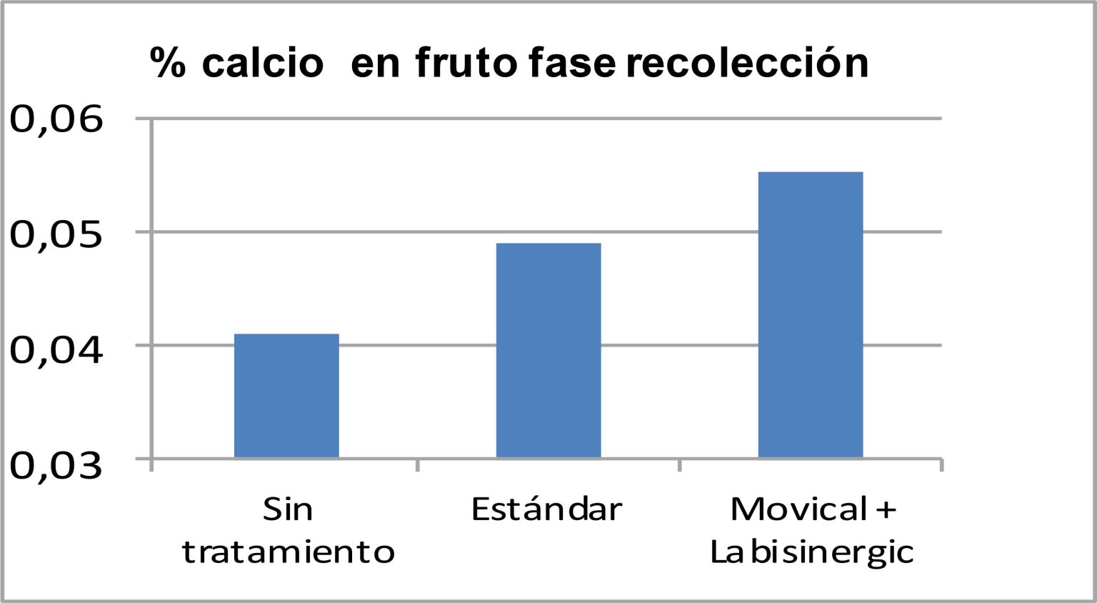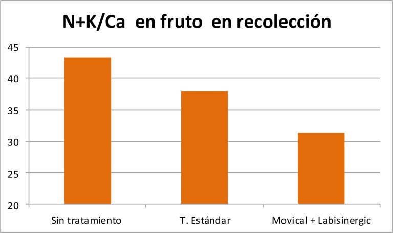 يحسّن استخدام 18 لتر/هكتار من LABIFOL MOVICAL + 2 لتر/هكتار من LABISINERGIC (في تطبيقات موزعة على 6 أسابيع) من المعايير الغذائية للفاكهة في وقت الحصاد.