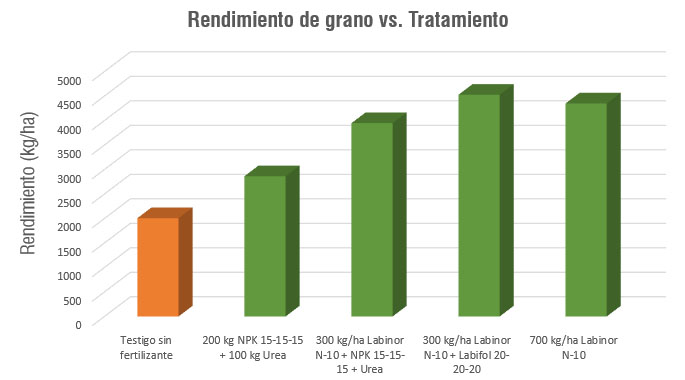 Segons aquests resultats, afirmem que el biofertilitzant LABINOR N-10 és agronòmicament més eficient en l’avaluació del rendiment en un cultiu de blat de moro respecte l’aplicació de fertilitzants químics convencionals, així com en comparació de la no aplicació de fertilitzant.