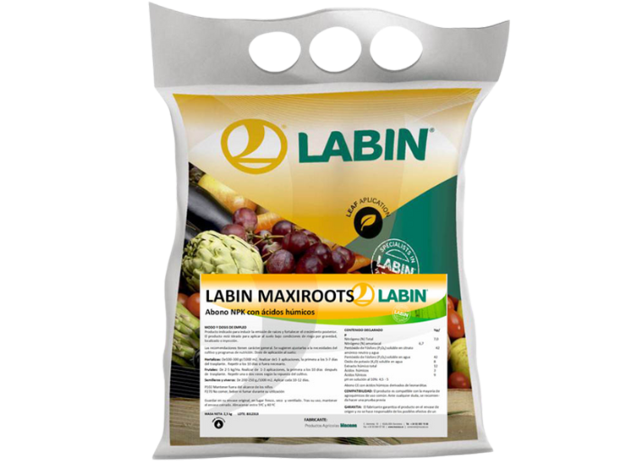 LABIN MAXIROOTS és un producte formulat en forma de concentrat soluble NPK a base d’àcids húmics, fúlvics, i macronutrients, que estimula el desenvolupament i el creixement de pèls radiculars absorbents. Les matèries primeres especialment seleccionades potencien el creixement de la massa radicular existent i indueixen la formació de nous pèls absorbents, aconseguint un sistema radicular sa i vigorós durant tot el cicle de cultiu. A les plantes ja establertes aconseguim una millor resposta al trasplantament minimitzant els efectes adversos que l’estrès post-trasplantament produeix.